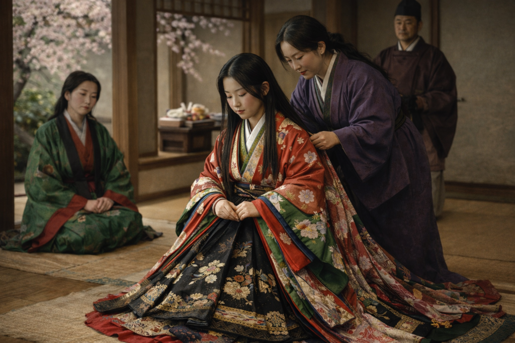 裳着:女性の場合、12歳から16歳の頃に裳を着用することで成人として認識され、髪型も大幅に変化します。これにより、女性としての社会的役割の認識が期待されました。