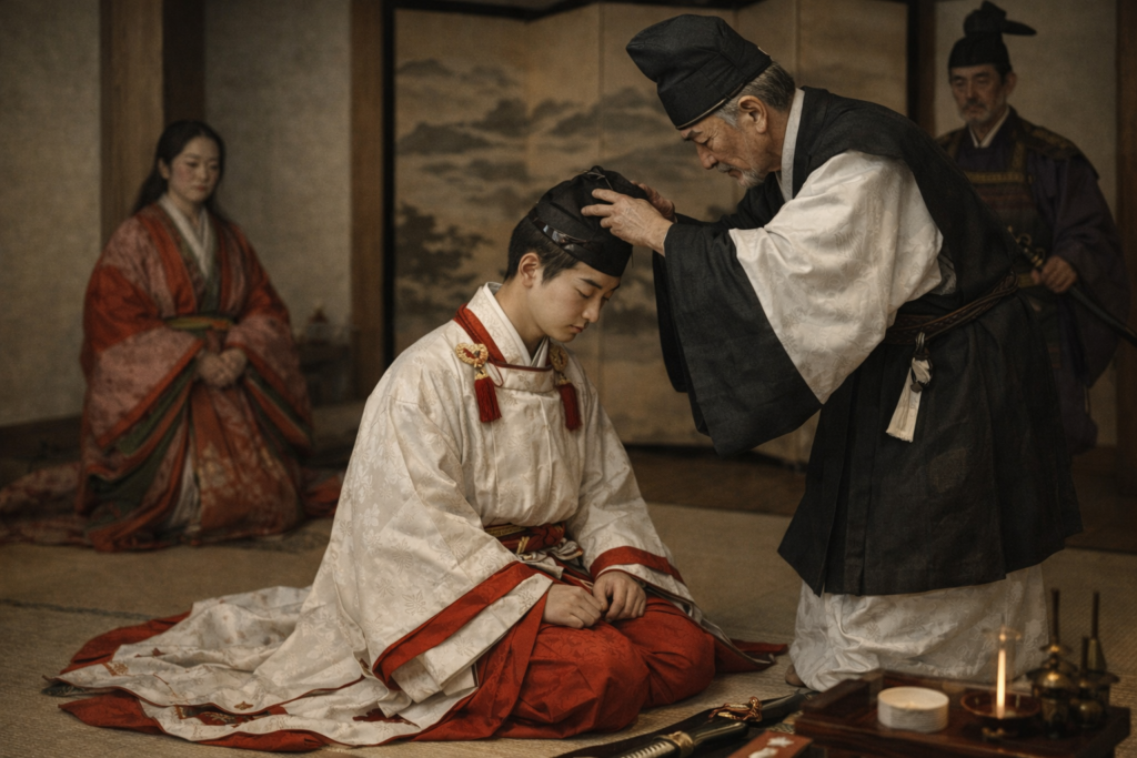 元服:男性は、髪型を変え、特別な衣装を身につけることで成人を証明するために冠を被ることが求められました。